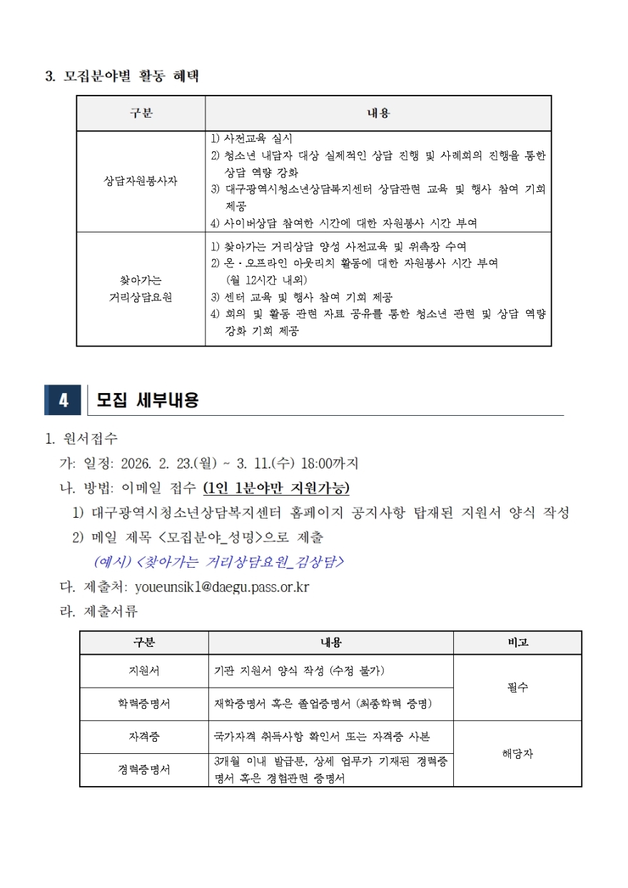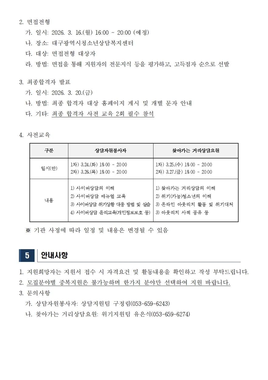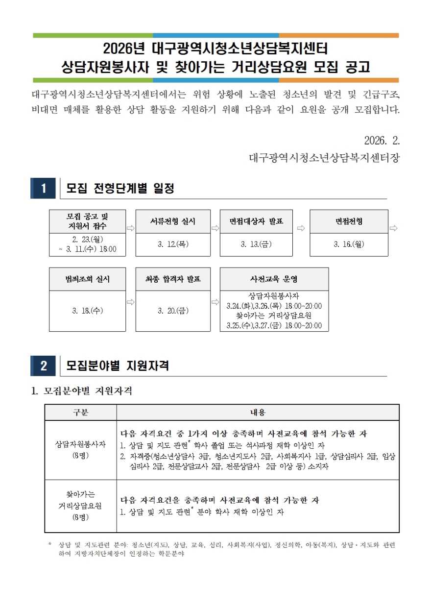 | 2026년 대구광역시청소년상담복지센터 상담자원봉사자 및 찾아가는 거리상담요원 모집 |