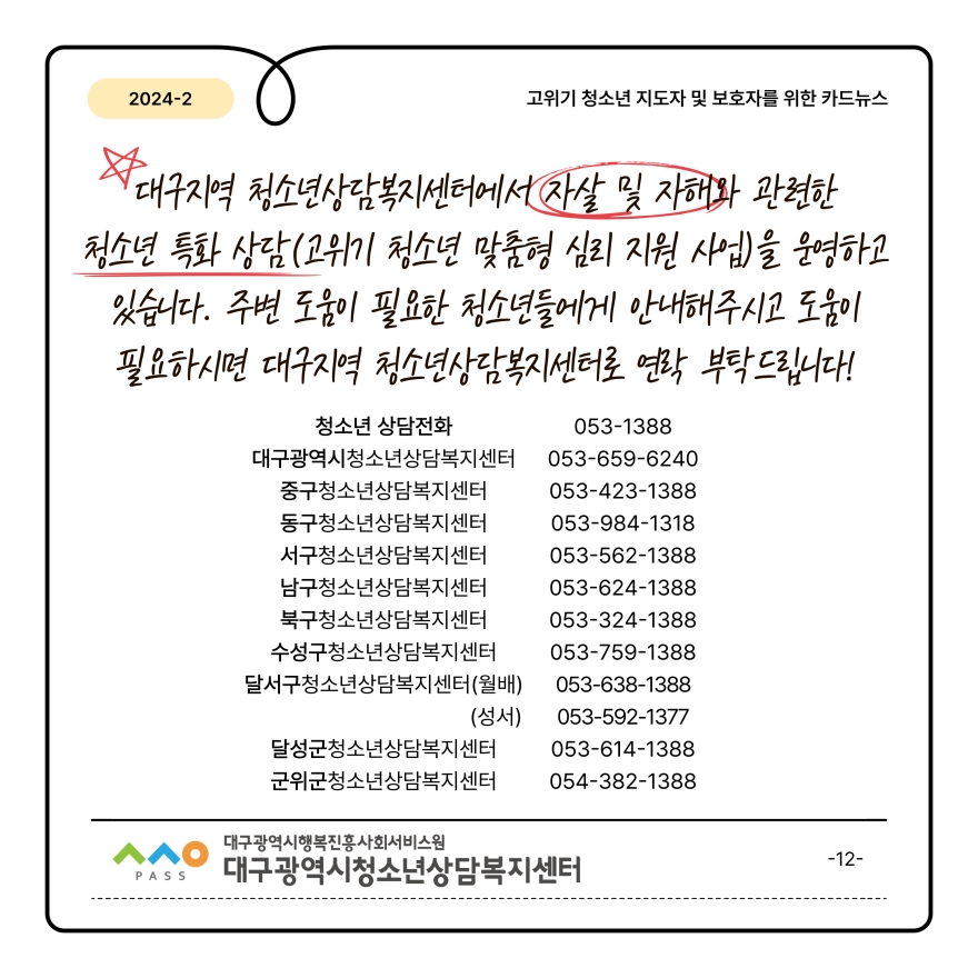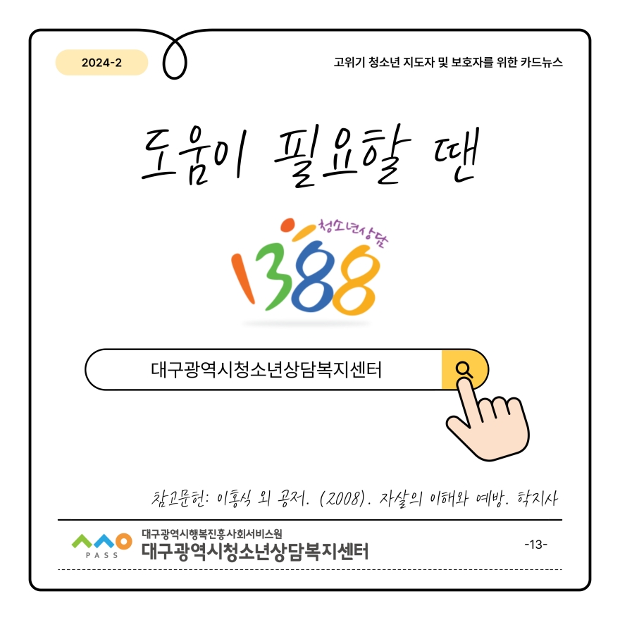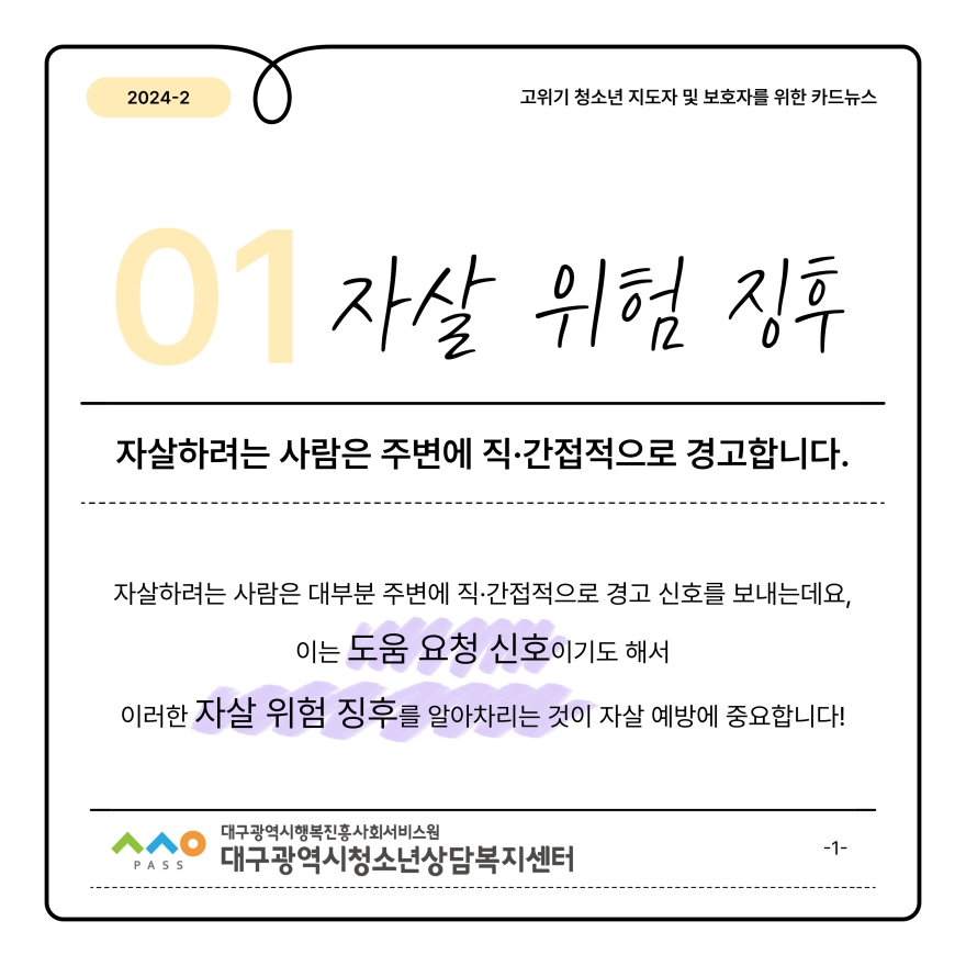 | 다음글 | 2024년 고위기 청소년 카드뉴스 청소년 우울불안 |