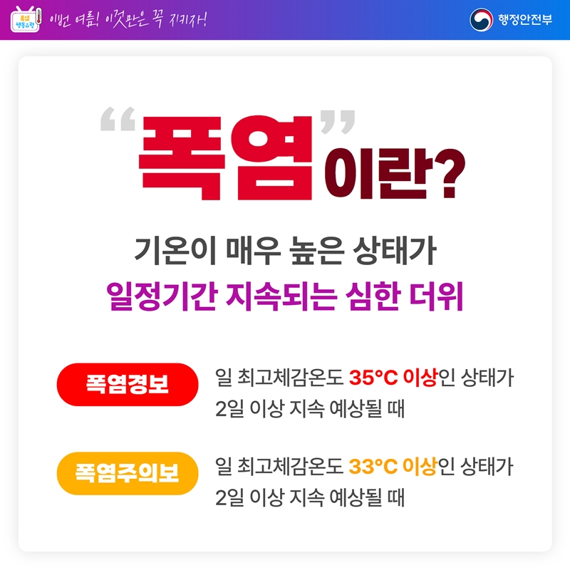 ① TV, 라디오, 스마트폰을 통해 무더위 등 기상정보를 매일 확인하기 ② 가장 더운 오후 2시부터 5시까지는 야외활동이나 작업을 되도록 하지않기 ③ 물을 자주 마시고, 외출할 때는 양산을 사용하기 ④ 폭염에 취약한 어르신들의 건강상태를 수시로 확인하고 부모님께 안부전화 자주 드리기 똑똑한 폭염 준비로 즐거운 여름 보내세요~